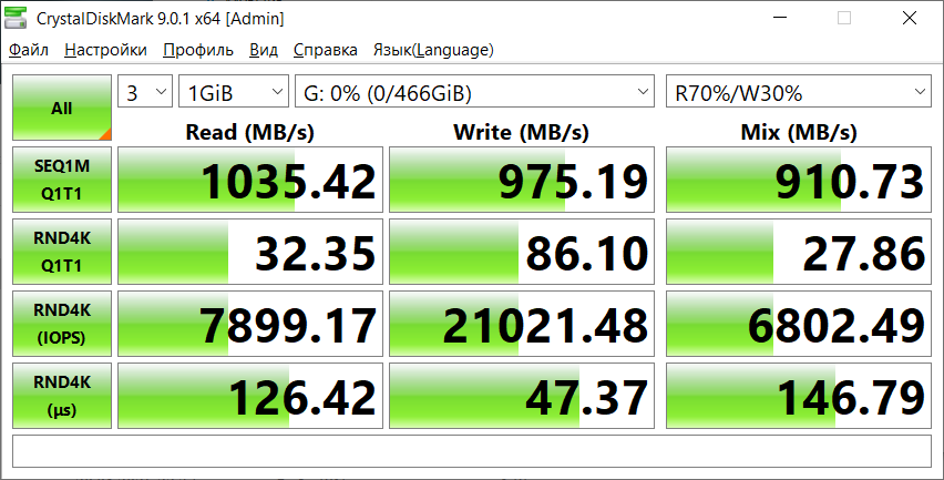 При последовательных операциях (SEQ1M Q1T1) накопитель выдает 1035.42 МБ/с при чтении и 975.19 МБ/с при записи. Эти показатели ложатся в рамки, обозначенные производителем, и подтверждают, что потенциал интерфейса USB 3.2 Gen2 здесь раскрывается по полной. В смешанном режиме (R70/W30) результаты чуть ниже — 910.73 МБ/с, но все равно весьма солидно для портативного накопителя.