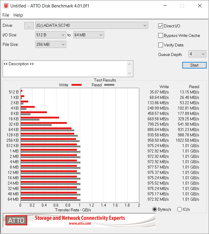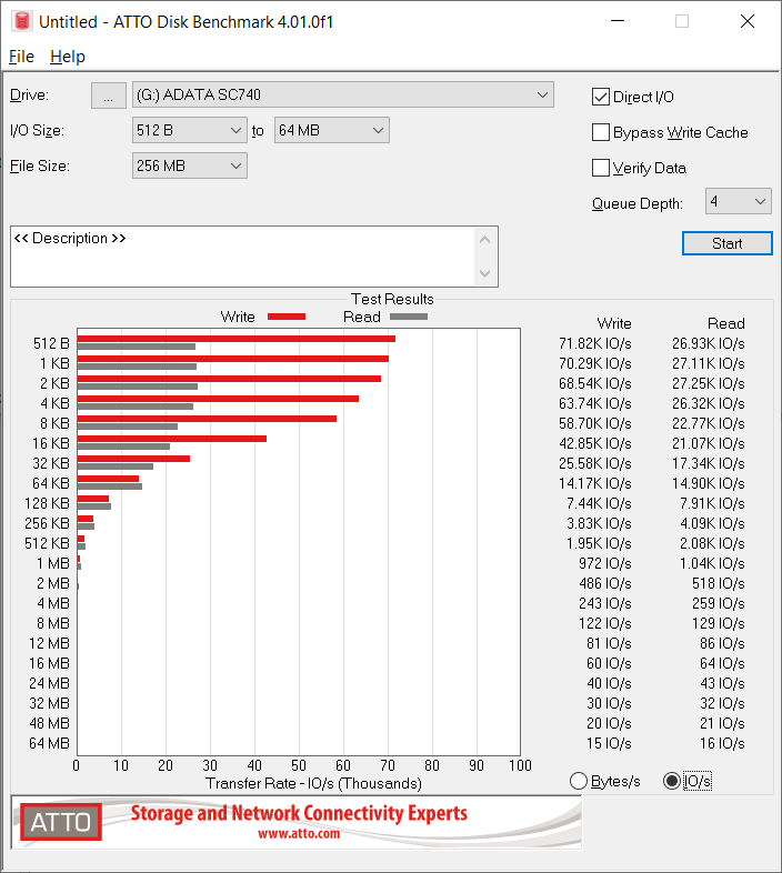 Итак…, давайте подведем черту. По итогам синтетических испытаний ADATA SC740 демонстрирует неплохие показатели пропускной способности как при чтении, так и при записи, полностью укладываясь в возможности используемого интерфейса. Анализируя графики, становится ясно, когда активируется буферная память, как устройство стабилизирует свою производительность и какие особенности проявляются при продолжительной последовательной записи. Важно отметить отсутствие каких-либо критических сбоев или непредсказуемого поведения — все процессы протекают логично.