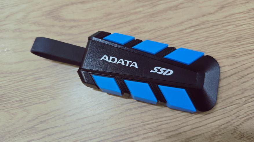 Корпус ADATA SC740 вытянутый, со скошенными торцами, визуально напоминает брелок. Основной цвет корпуса черный и голубой, поверхность матовая, с выраженной текстурой пластика. По центру верхней поверхности проходит продольная вставка с надписью ADATA SSD.