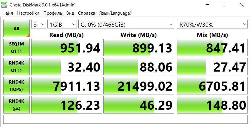 Далее переключаемся на профиль «реальной скорости», что дает более приземленные показатели. В последовательном режиме (SEQ1M Q1T1) скорость чтения достигает 951.94 МБ/с, а записи — 899.13 МБ/с. В смешанном сценарии (R70/W30) цифра останавливается на 847.41 МБ/с. При случайном доступе 4K в режиме Q1T1 видим 32.40 МБ/с при чтении, 88.06 МБ/с при записи, и 27.47 МБ/с в смешанной нагрузке. В пересчете на IOPS получаем 7911 операций при чтении, 21499 при записи и 6705 в смешанном режиме. Задержки при этом остаются примерно на том же уровне: 126.23 мкс для чтения, 46.29 мкс для записи и 148.80 мкс при комбинированной нагрузке.