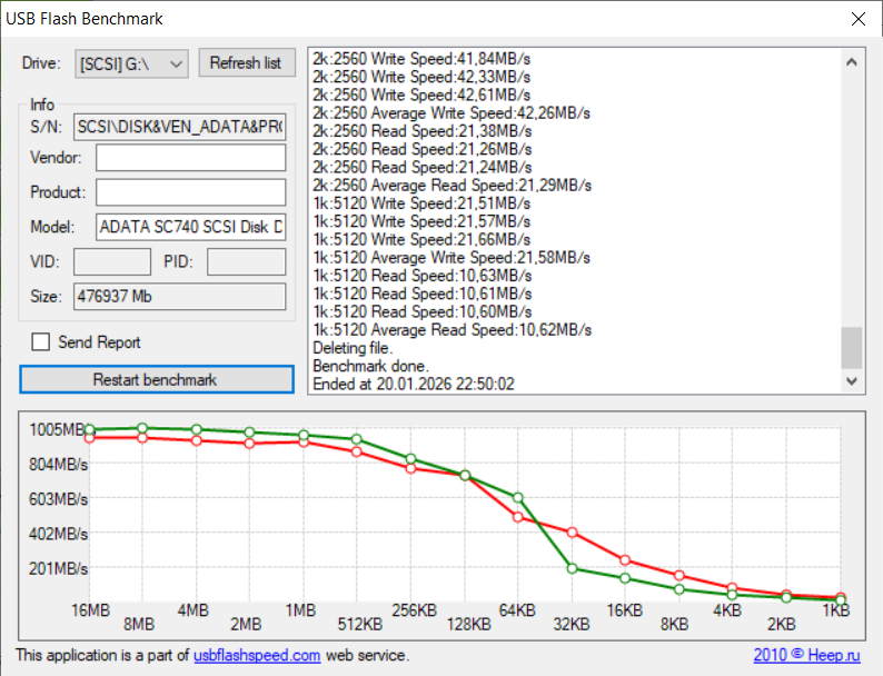 ADATA SC740 определяется без проблем, доступный объем — 476937 МБ. Прогон завершается успешно, без каких-либо сбоев. На графике видно, что при работе с большими блоками данных, от нескольких мегабайт до примерно 256-512 КБ, скорости чтения и записи близки к максимальным для интерфейса. Чтение находится на уровне около 1 ГБ/с, запись лишь немного уступает, без критичных просадок. Это коррелирует с данными, полученными ранее в CrystalDiskMark и ATTO при последовательных операциях. Однако, начиная с блоков размером 128 КБ, производительность начинает плавно снижаться. В диапазоне 64-16 КБ это падение становится более заметным, а при переходе к блокам 1-2 КБ значения опускаются до нескольких десятков мегабайт в секунду. В текстовом отчете усредненные показатели подтверждают это: для профиля 2K скорость записи составляет около 42 МБ/с, чтения — порядка 21 МБ/с; для 1K — приблизительно 21 и 10 МБ/с соответственно.