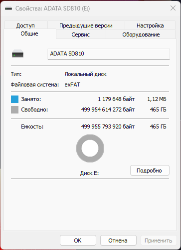 После подключения к компьютеру внешнего SSD-накопителя ADATA SD810 автоматически определяется операционной системой. Сам накопитель отформатирован в файловую систему exFAT, обеспечивающую совместимость с различными операционными системами, но при необходимости пользователь может выполнить переформатирование в NTFS. Фактический объем доступного пространства протестированной модели номиналом 500 ГБ составил 465 ГБ, что соответствует стандартному расчету емкости накопителей.