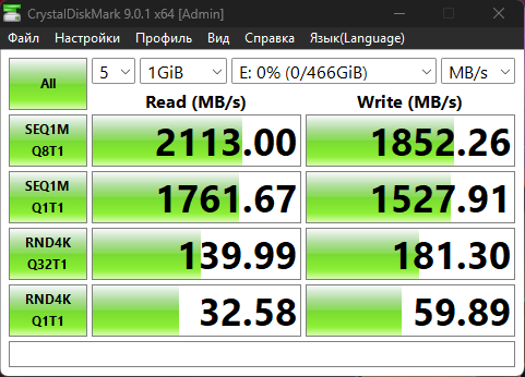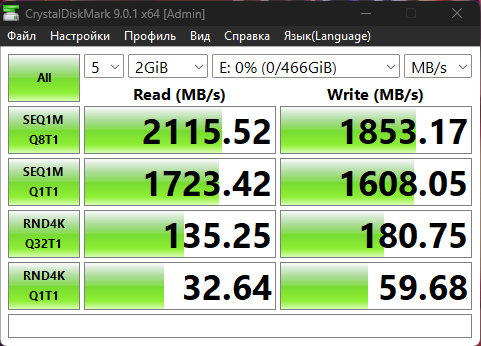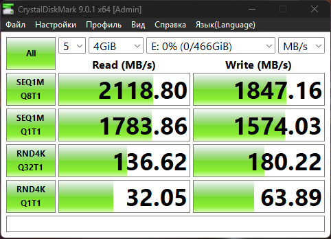 При тестировании накопителя в CrystalDiskMark с различными размерами файлов (1000 МБ, 2000 МБ и 4000 МБ) были получены стабильные показатели производительности. Скорость чтения близка к заявленным характеристикам, тогда как скорость записи демонстрирует незначительное отклонение в меньшую сторону. В целом результаты тестирования соответствуют ожиданиям для данной модели накопителя.