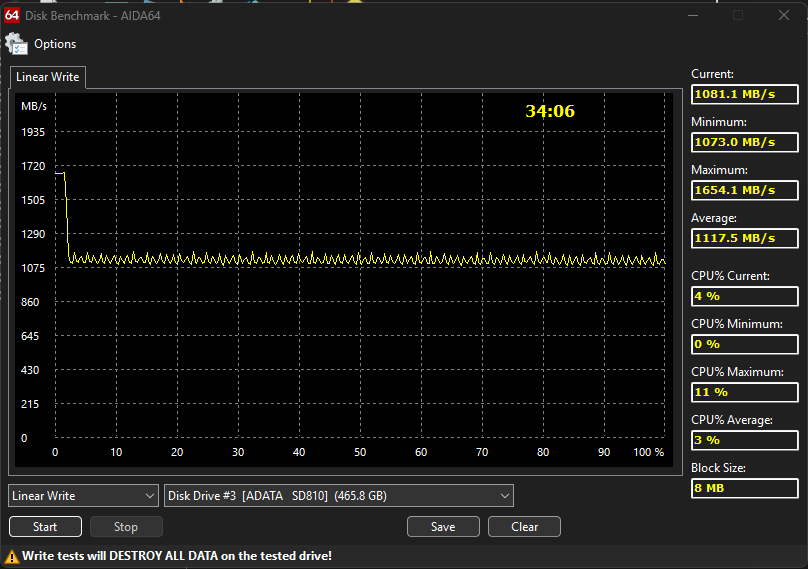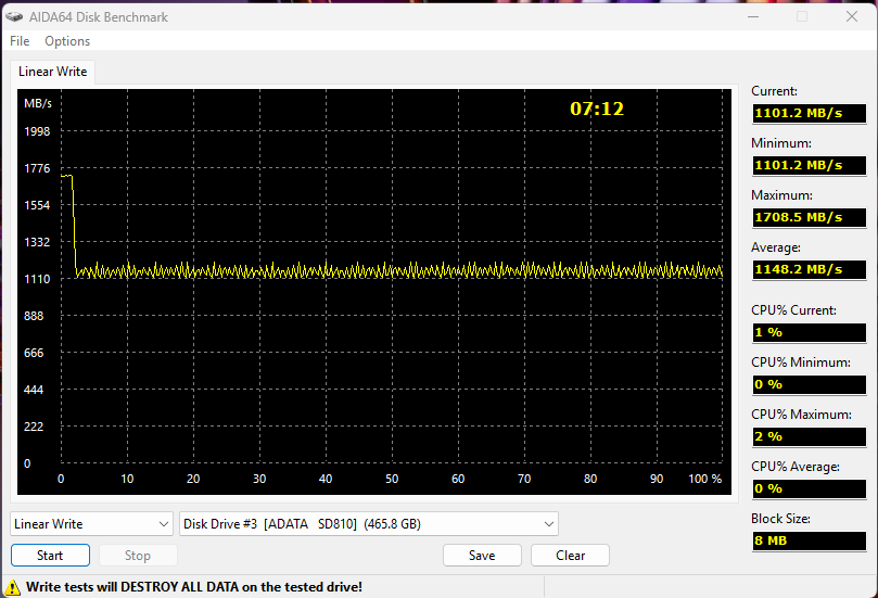 Тест линейной записи в AIDA64 Extreme демонстрирует характерное для TLC-накопителей поведение, однако в версии 4.73 тест проходится практически в 5 раз быстрее, чем в версии 8.00.