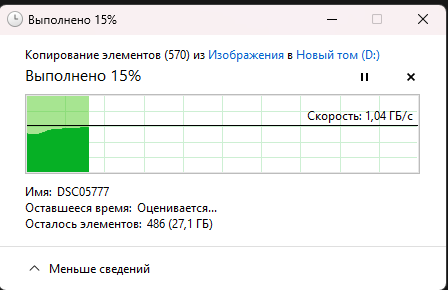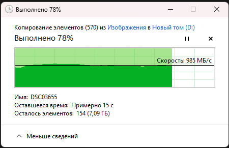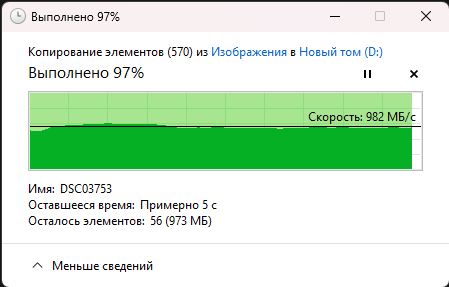 При копировании обычных файлов скорость копирования файлов достигала 990 МБ/с с редкими пиками от 1,04 ГБ/с до 1,12ГБ/с.
