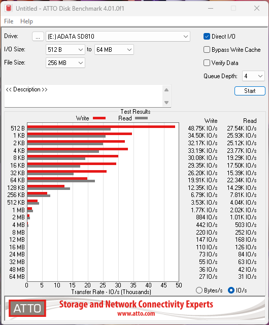 Результаты тестирования в ATTO Disk Benchmark показывают, что реальная производительность внешнего SSD-накопителя ADATA SD810 отличается от заявленных характеристик. Пиковая скорость операций достигает 1.62 Гб/с, что существенно ниже декларируемых 2000 МБ/с как для чтения, так и для записи. Полученные данные свидетельствуют о том, что максимальные показатели производительности достигаются лишь в идеальных условиях тестирования.