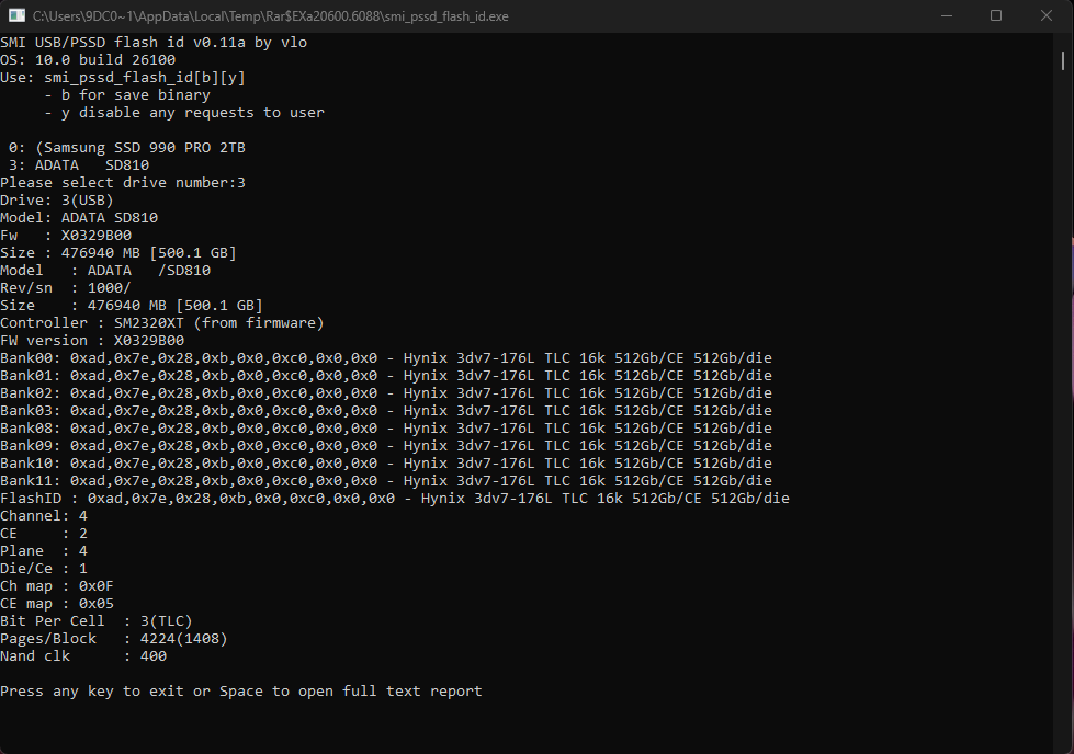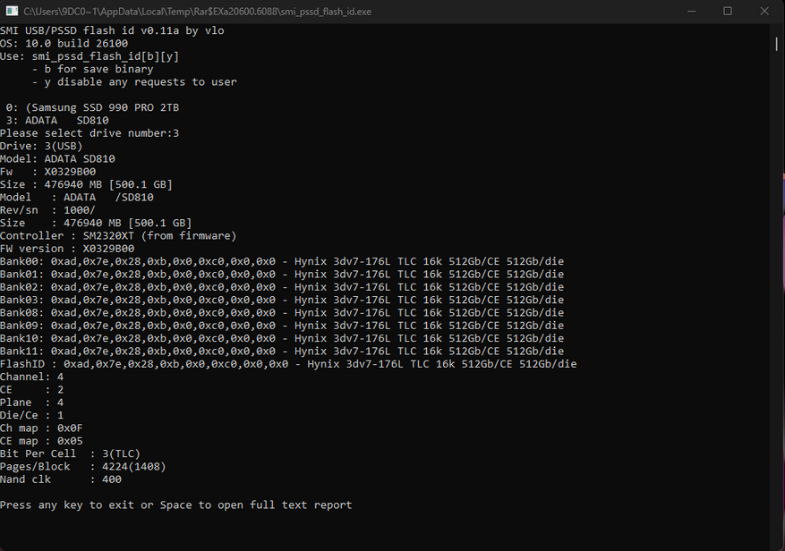 С помощью утилиты от Вадима Очкина aka vlo узнаем какие используются чипы памяти. В данном случае 176-слойные TLC производства Hynix.