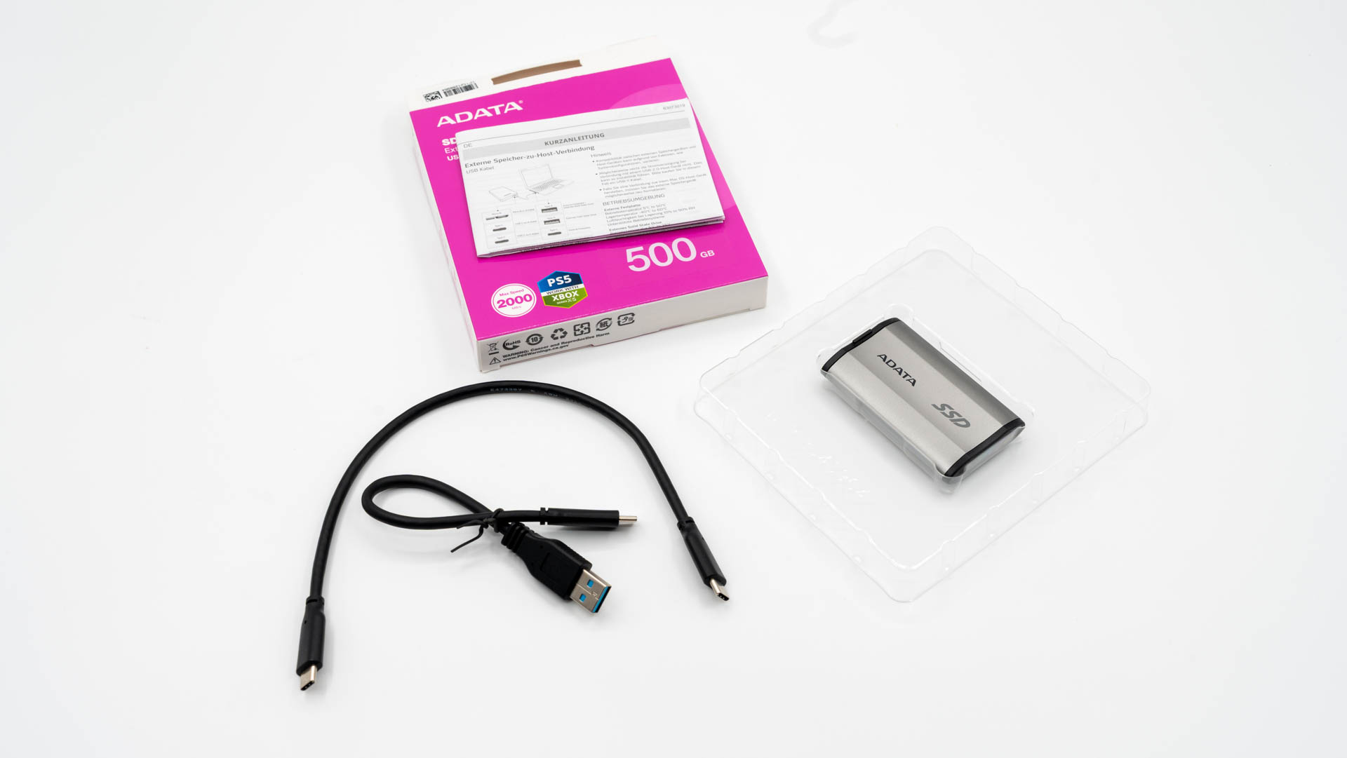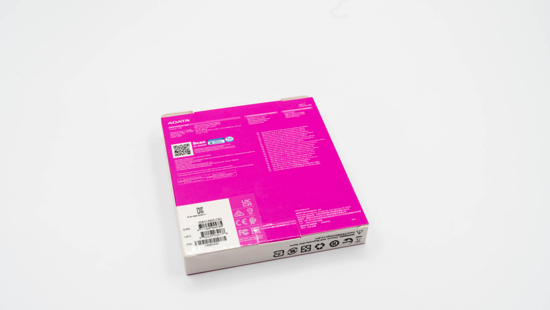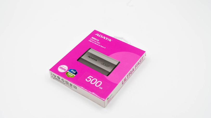 ADATA SD810 поставляется в стандартной для своего класса комплектации. В коробке вы обнаружите накопитель на пластиковой подложке, два соединительных кабеля (USB Type-A и Type-C) и бумажную документацию. Все компоненты аккуратно размещены в компактной коробке, украшенной розовым дизайном который можно назвать фирменным для внешних SSD накопитель от ADATA.