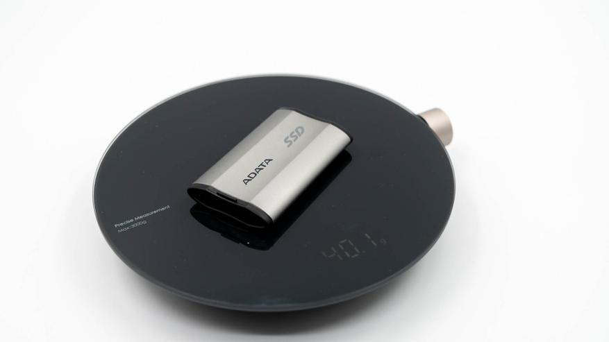 Корпус ADATA SD810 изготовлен из металла с пластиковыми вставками по бокам. Форма корпуса нестандартная: в сечении он не просто овал, а с центральной вогнутостью. Это делает накопитель удобным в использовании и снижает риск выскальзывания из рук. Габариты данного накопителя небольшие и составляют 7,2 х 4,4 х 12,2 мм. В качестве примера приведу сравнение с вещами, с которыми вы постоянно сталкиваетесь. Вес данного накопителя составляет 40,1 грамм.