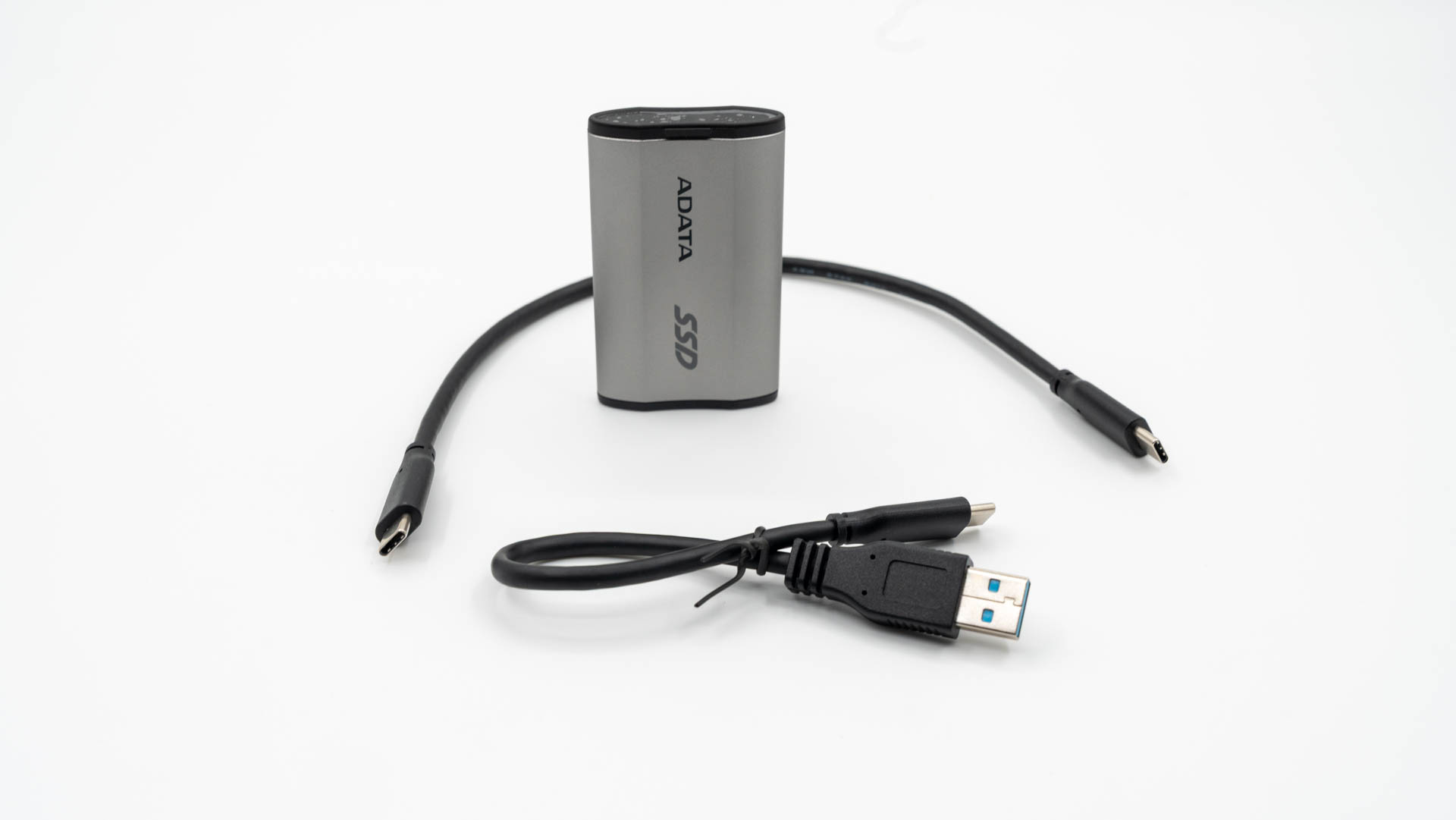 Для подключения внешнего SSD-накопителя ADATA SD810 к различным устройствам — компьютерам, смартфонам, телевизорам и другой технике — в комплекте предусмотрены два кабеля: USB Type-C — Type-C и USB Type-A — Type-C. Такое решение от компании ADATA обеспечивает универсальность подключения: первый кабель подходит для современных устройств с портами Type-C, а второй — для работы с традиционными USB-портами, что избавляет от ограничений совместимости со старым оборудованием.