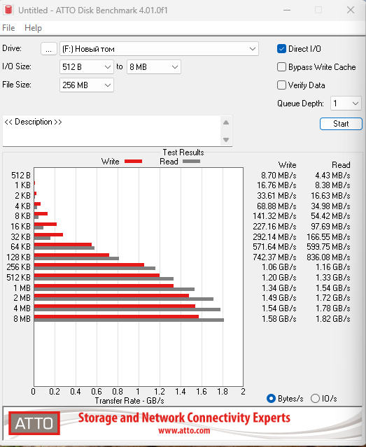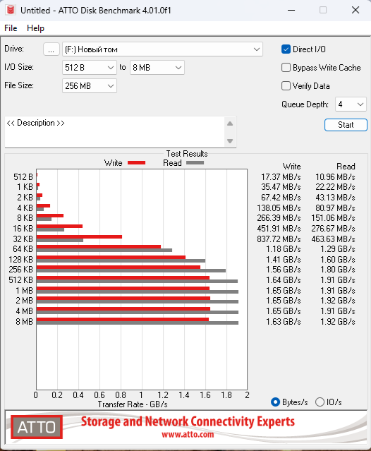 Результаты в программе ATTO Disk Benchmark, при разной глубине очереди: