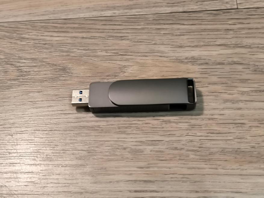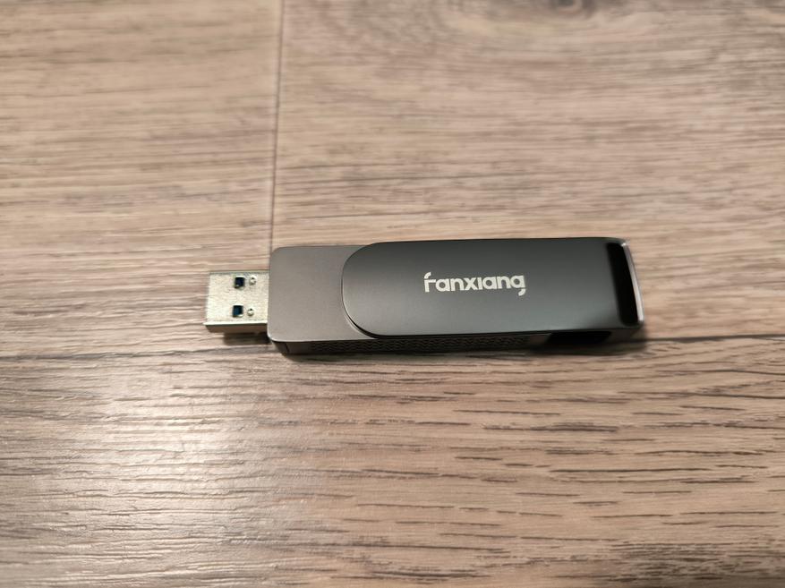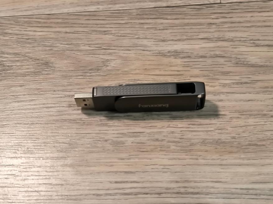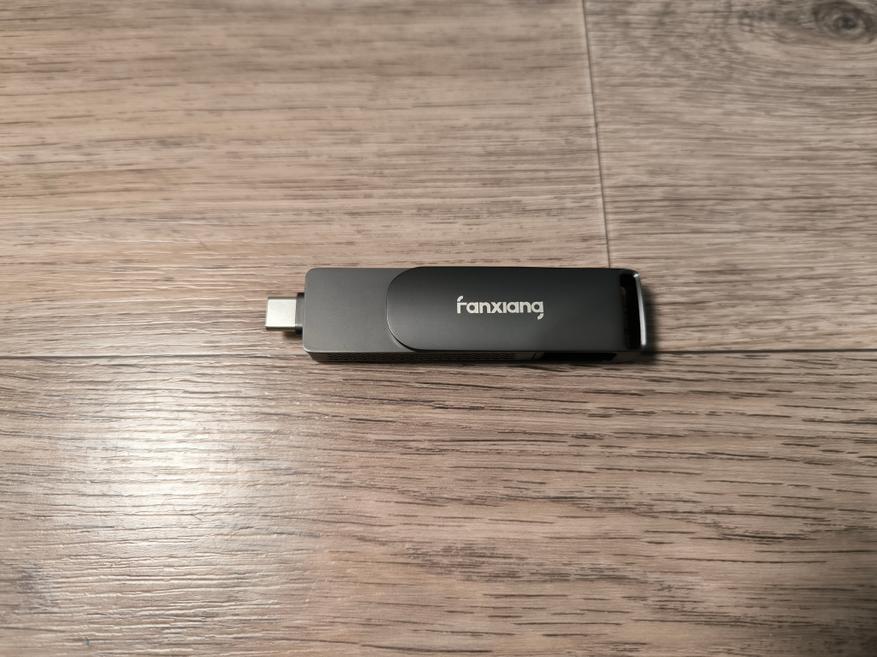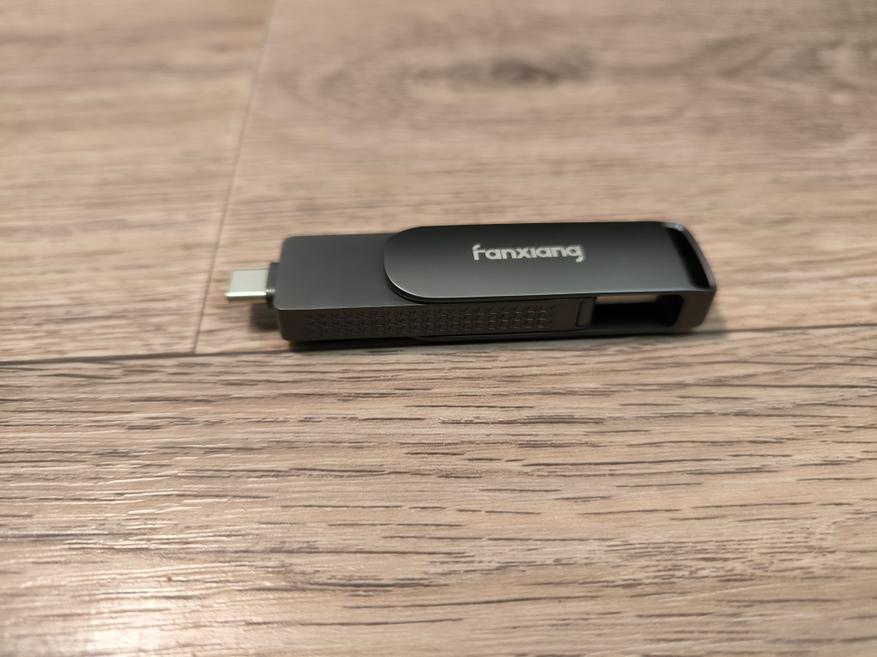Корпус накопителя изготовлен из металла (заявлен цинковый сплав). Как видно на фотографиях, накопитель состоит как бы из основной части, на сторонах которой расположены разъёмы USB-A и Type-C, и поворотной крышки, которая имеет ушко для крепления ремешка. За счёт того, что крышка поворотная, можно поочерёдно пользоваться как USB-A, так и Type-C разъёмом. Похожие решения встречались и в обычных «флэшках», но поворотная часть там обычно просто служила как колпачок для единственного разъёма, при том что у Fanxiang F951, как не крути, один разъём всегда останется открытым. На гранях корпуса присутствуют противоскользящие насечки.
