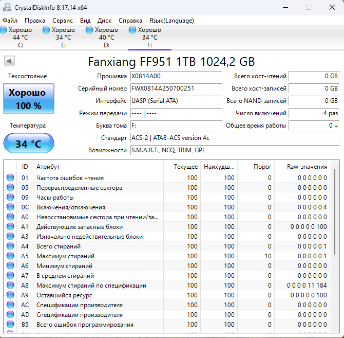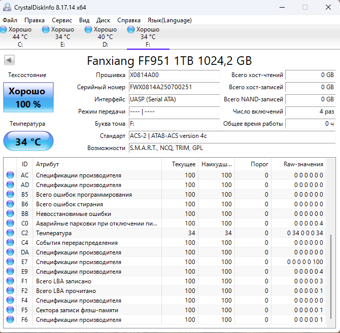 Как видим, информации выводится много, но часть параметров определилось как «спецификации производители», и в этом нет ничего необычного, когда мы говорим про накопитель на контроллере SM2230.
