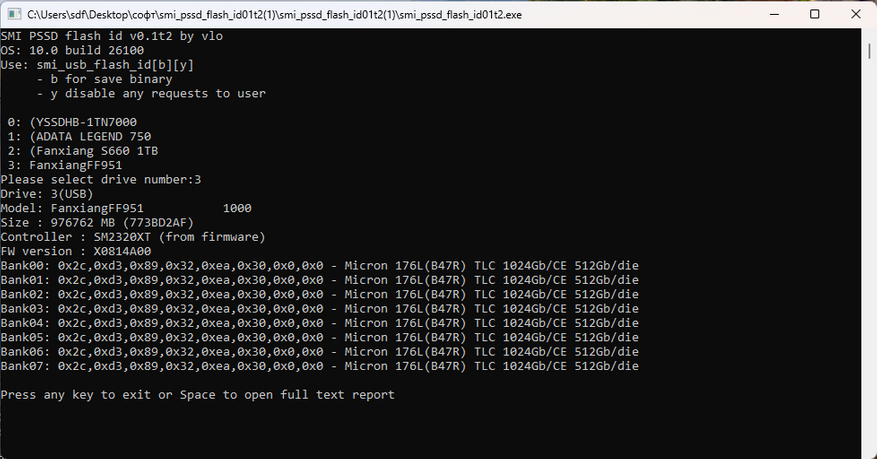 Как и обещал, просмотрим информацию о контроллере, и естественно данные о применённой Flash памяти, воспользовавшись утилитой от Вадима Очкина (vlo).