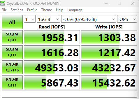 Взглянем конечно же и на результаты в программе CDM. На первом ряду скриншотов результаты в МБ/c, а на втором, те же результаты, но уже переведённые в значение по IOPS.