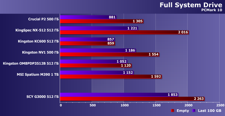 Чтобы посмотреть, как это проявляется в общем и целом, как обычно проведем тестирование в PCMark 10 Storage Full System Drive. При всех его недостатках и синтетической природе, лучшего комплексного бенчмарка на данный момент все равно нет — что не делает его идеальным, зато делает практически безальтернативным. Собственно, подобных инструментов всегда мало было, а предыдущие версии вовсе на SSD не рассчитаны все-таки. Поэтому результаты этой важны и показательны. Главное правильно их сравнивать, для чего стоит грамотно подобрать ориентиры.