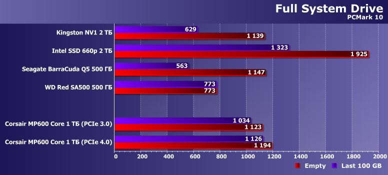 Согласно PCMark 10 Storage Full System Drive какой-никакой прирост от нового интерфейса (скорее – от непосредственной связи с процессором) есть. Но микроскопический – так что обращать внимание на его поддержку не стоит. Впрочем, априори ясно было – даже «взрослые» модели на базе Phison E16 и TLC-памяти не лучший выбор, если вам и правда кровь из носу нужен PCIe 4.0. От того, что память поменяли на более медленную, улучшиться ничего не могло. На самом деле, конечно, ухудшилось и заметно – к примеру, Corsair Force MP600 2 ТБ «набивает» порядка 2000 попугаев (чуть меньше в 3.0, чуть больше в 4.0), а тут в пару раз меньше. Но есть и положительные моменты. Во-первых, тут «забитость» данными почти никак не сказывается – «просадка» пока минимальная для всех QLC, что я тестил. Таким образом, производительность оказывается в среднем выше, чем у любых SATA-накопителей – и всегда. А вот SSD на Phison E13T и QLC просаживаются до уровня бюджетных SATA на той же QLC. Что называется, почувствуйте разницу. Но вот Intel’ы заметно побыстрее все-таки – хоть у них производительность и падает, однако падает до того же уровня, выше которого MP600 Core не поднимается.