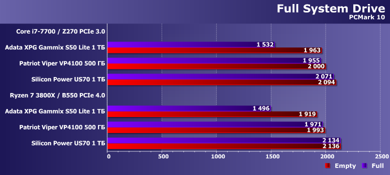 На эти же мысли наводит и падение производительности в PCMark 10 Full System Drive в заполненном данными состоянии. Причем и размер его аналогичен тому, как вели себя модели предыдущего поколения. И, любопытная деталь – поскольку терабайтный S11 Lite на практике воспользоваться ускорением интерфейса не может, в его случае наблюдается даже некоторое снижение производительности (согласно PCMark 10 во всяком случае) при обновлении платформы. А для сравнения я тут взял пару моделек на Phison E16 – в их случае совсем иная картина: терабайтные модификации набивают в «родном» режиме больше попугаев, нежели в старой системе, а «пол-литровые» — хотя бы не меньше. Что еще важнее – в любом случае производительность «в забитом состоянии» не снижают.