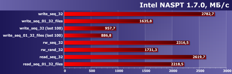 В NASPT производительность в системе на базе Ryzen таки оказывается немного выше, чем на старом стенде. Но можно ограничиться только первым случаем – главное тут разница между первыми двумя парами строк. В которых повторяется сказанное выше – динамическое кэширование, все данные через SLC-кэш, с очисткой последнего устройство не спешит.