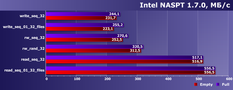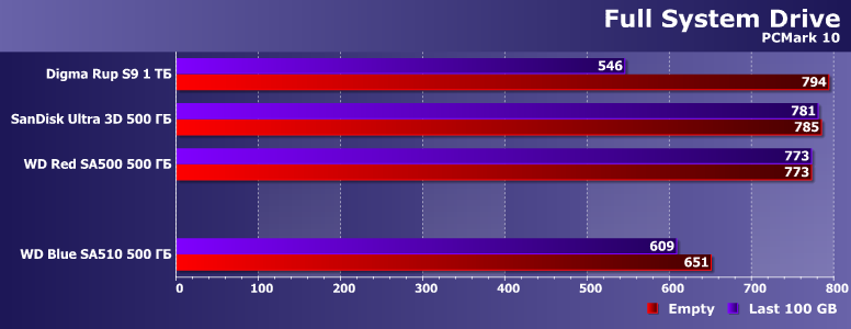Родственные связи с WD Green прослеживаются – производительность высокой назвать сложно. Правда Green и за 400 баллов не выбирался, а тут стабильные 600+. И от нехватки свободного места накопитель почти не страдает. То есть, учитывая сегодняшнее состояние дел в SATA-сегменте и особенно всё более частое использование QLC-памяти даже при емкости в 500 ГБ, не говоря уже о 1 ТБ, Blue SA510 – хороший накопитель. Но не на столько хороший, какими были предыдущие Blue. Иногда он и их обогнать может, но в среднем это другое.