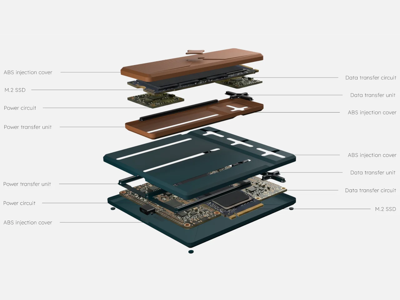 Основу Uroq составляет плоская квадратная платформа-база с портом USB-C для подключения к компьютеру. Внутри каждого модуля размещается SSD формата M.2. Когда ёмкость текущего накопителя исчерпана, пользователь устанавливает поверх него дополнительный блок. Модули фиксируются друг на друге при помощи защёлкивающихся контактов единой геометрии. Через встроенные в основание шины передаются питание и данные по интерфейсу PCIe или SATA. При подключении к компьютеру вся стопка модулей определяется как единый том, а соединение осуществляется одним кабелем USB-C.