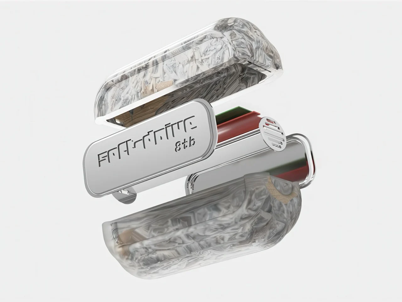 Корпус накопителя выполнен полупрозрачным, что позволяет видеть внутреннюю волокнистую структуру материала и электронные компоненты. Конструкция дополнена плетёным шнурком для ношения устройства.