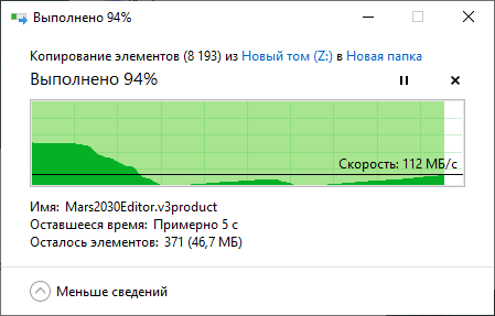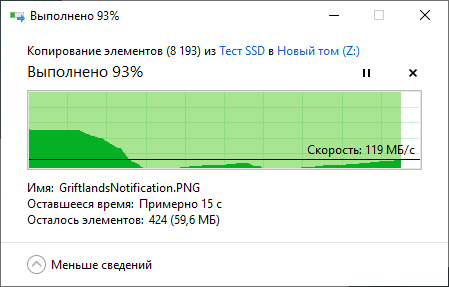 Вторым этапом тестирования накопителя SSD Silicon Power XD80 512GB было тестирование работы устройства в реальных условиях. Для этого были произведены операции чтения/записи файлов больших объемов и папок, содержащих большое количество небольших файлов.
