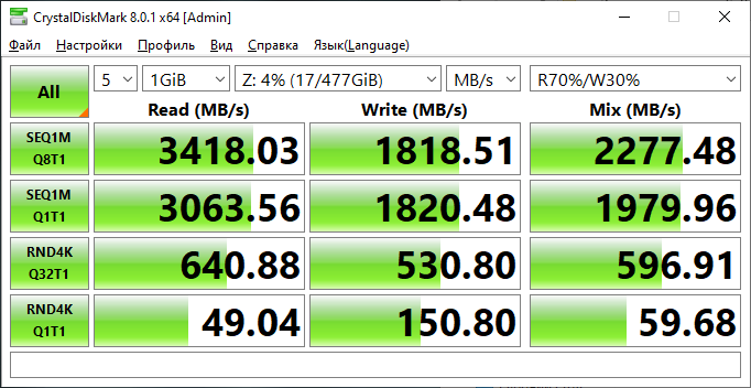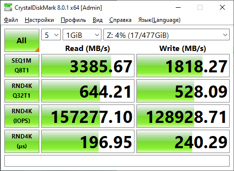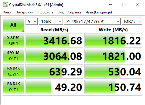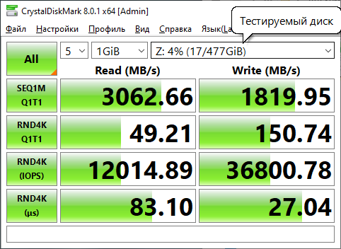 Тестирование при помощи утилиты CrystalDiskMark8.0.1