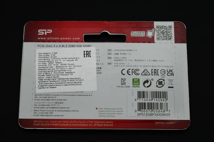 Поставляется SSD Silicon Power XD80 512GB в небольшой картонной упаковке, на лицевой поверхности которой находится прозрачный блистер, через который отлично просматривается устройство.