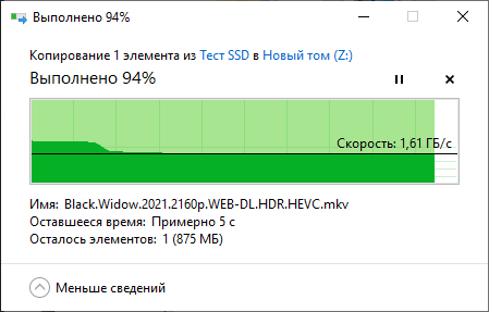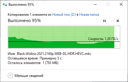 Запись тестового файла объем которого составляет 17.6 Гб, с SSD Silicon Power XD80 на накопитель SSD Kingston NVMe PCIe KC2500