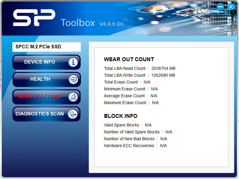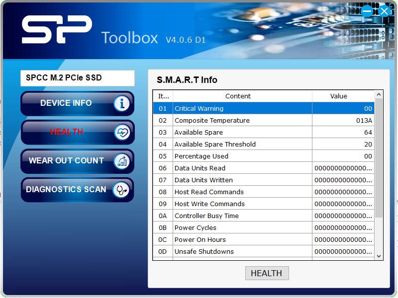 Как и у большинства производителей, у Silicon Power имеется фирменное программное обеспечение, позволяющее контролировать состояние накопителя. Приложение отображает расширенную информацию о SSD накопителе, позволяет осуществлять диагностику и производить оценку состояния устройства по параметрам S.M.A.R.T.
