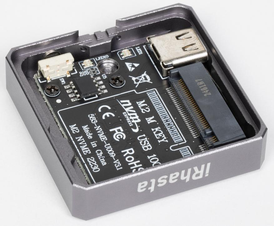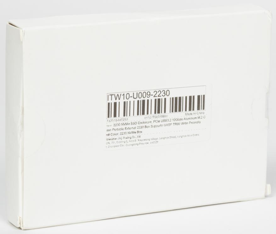 А я решил посмотреть — как это работает. Для чего купил очередную коробчонку под M.2 2230 от iRhasta — марка уже опробована. Стоит, кстати, всего рублей на 200 дороже, чем купленная год назад, что мелочи — особенно для тех, кому эта самая защита от записи нужна. Пришла за обычные 10 дней в абстрактной белой коробке.