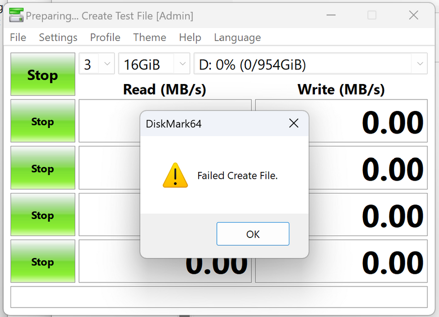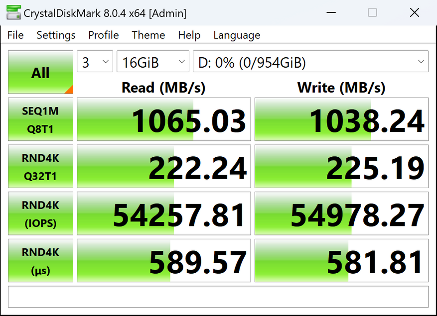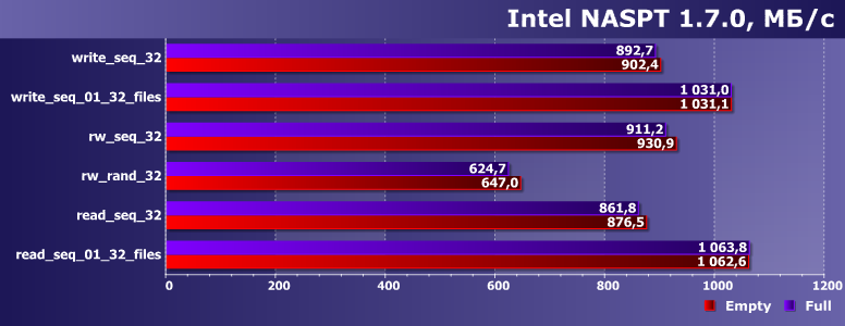 Для простоты попробовал запустить CrystalDiskMark. Тест закончился очень быстро, поскольку