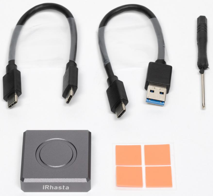 Внутри всё также, как в прошлом году — сам кейс, два коротких USB-кабеля, отвёртка да термопрокладки.
