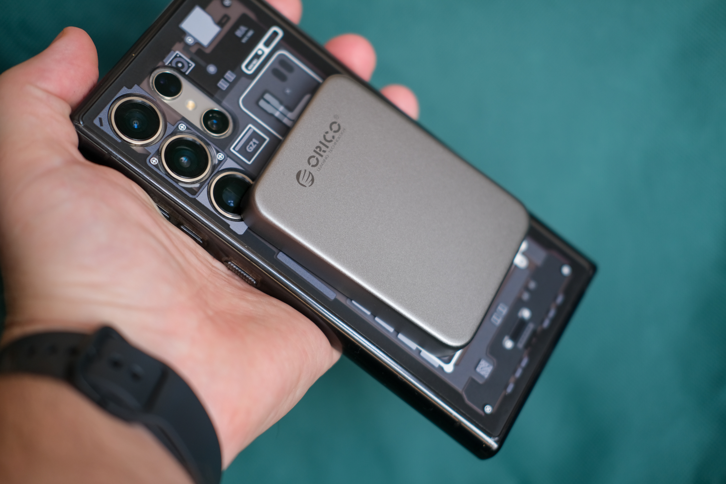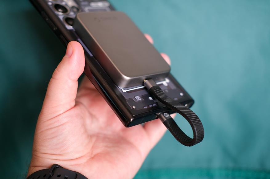 Кстати вот этот кружочек, это магнит. И у меня он прекрасно работает со встроенным в чехол магнитом на телефоне Samsung S24 Ultra