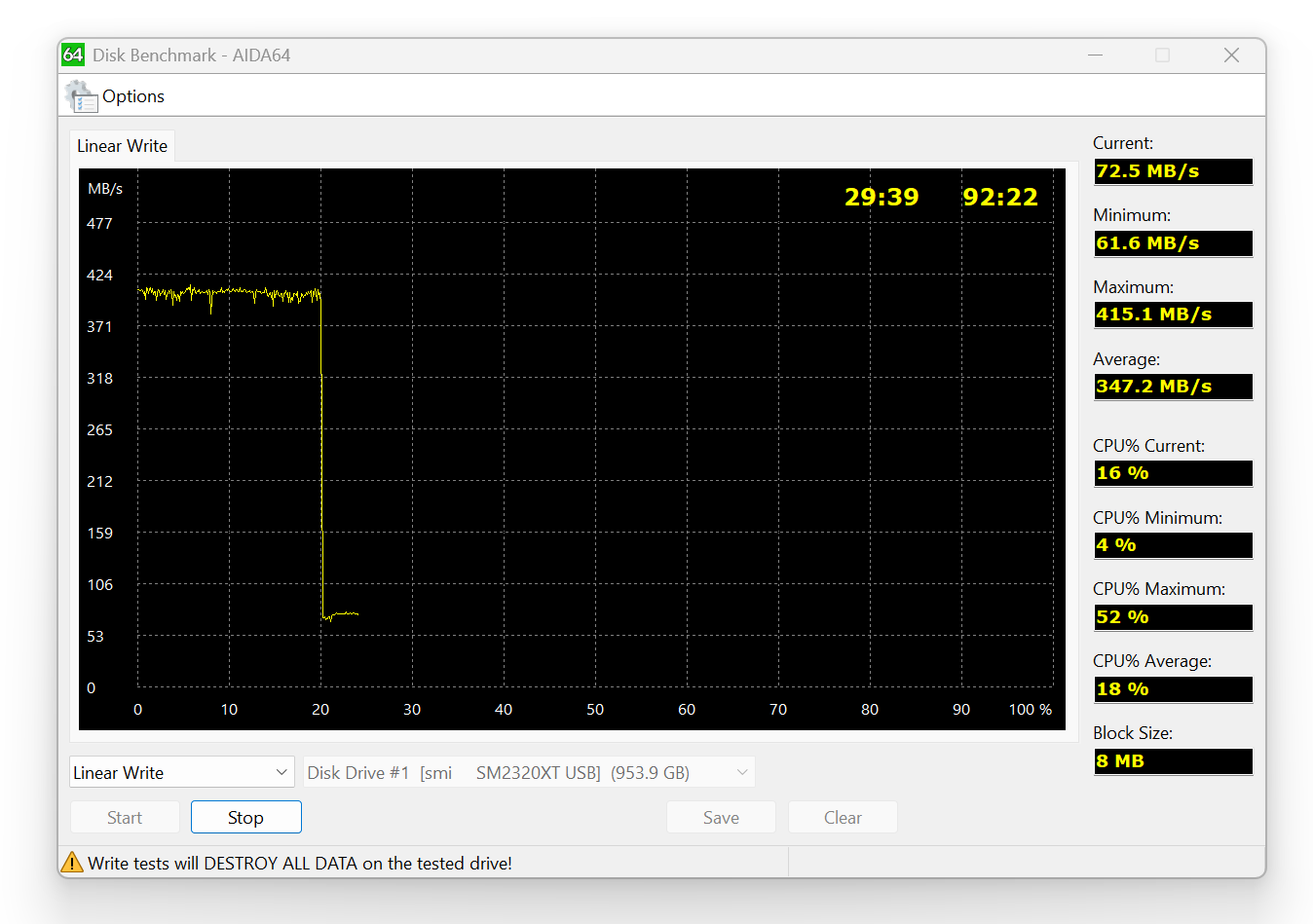 Весь объём диска записывать не стал, уже понятно где произошло падение скорости.