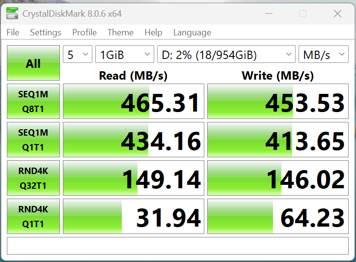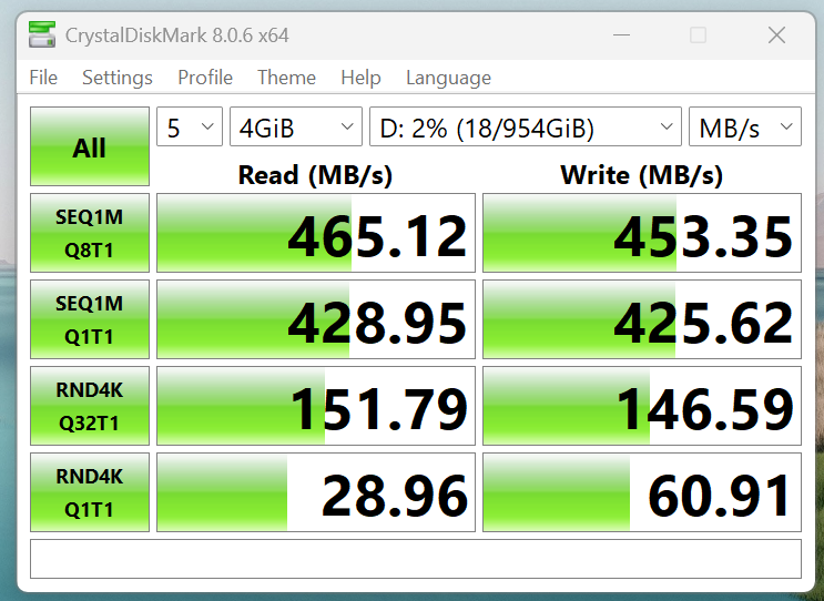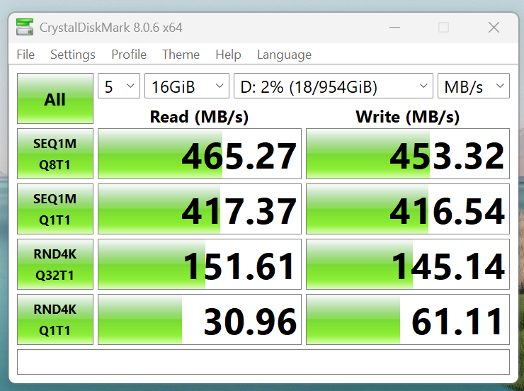 Стандартные три прогона. Средняя скорость записи около 453 MB/s, а скорость чтения 465 MB/s. Причём меня удивило очень близкие цифры, и мне кажется что вся скорость не раскрыалсь при подключении. Но даже этого уже достаточно чтобы быстро закинуть или скачать какую либо информацию.