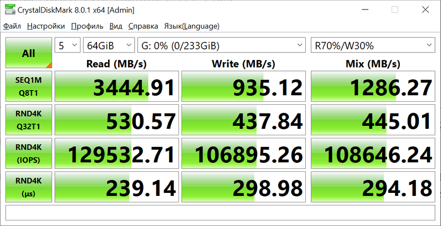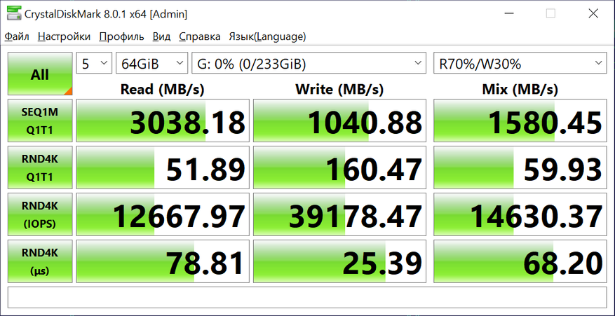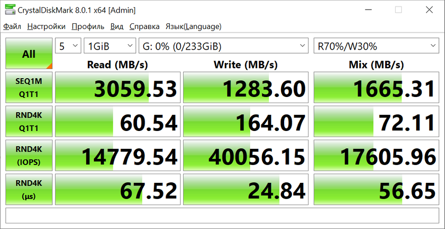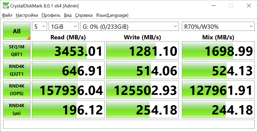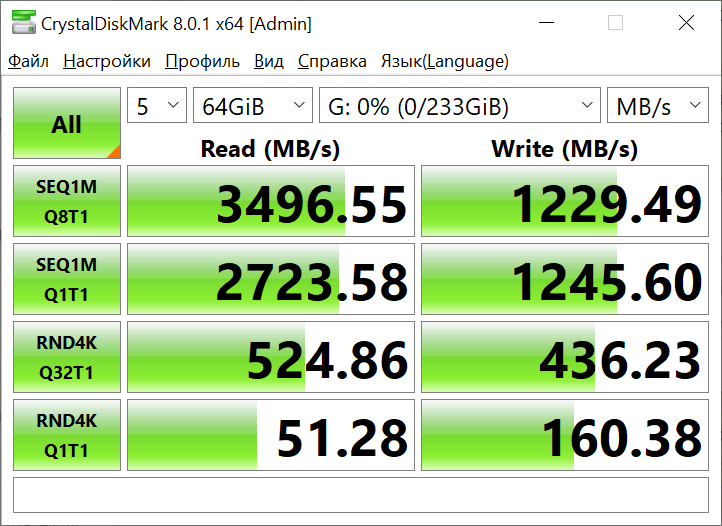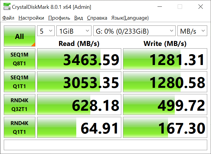 Результаты тестирования полученные при помощи утилиты CrystalDiskMark8.0.1