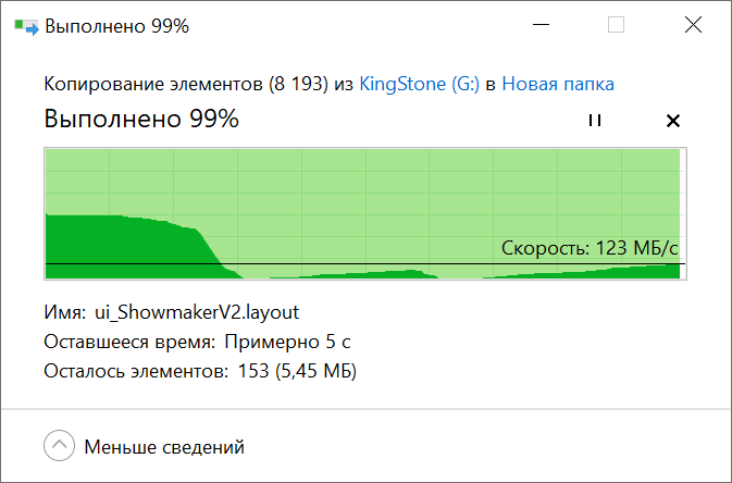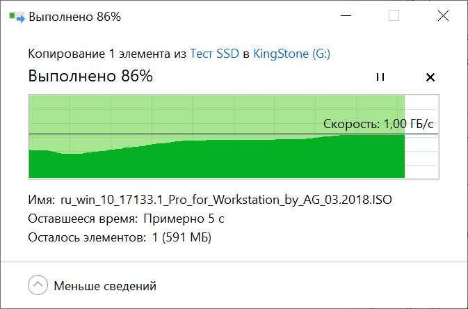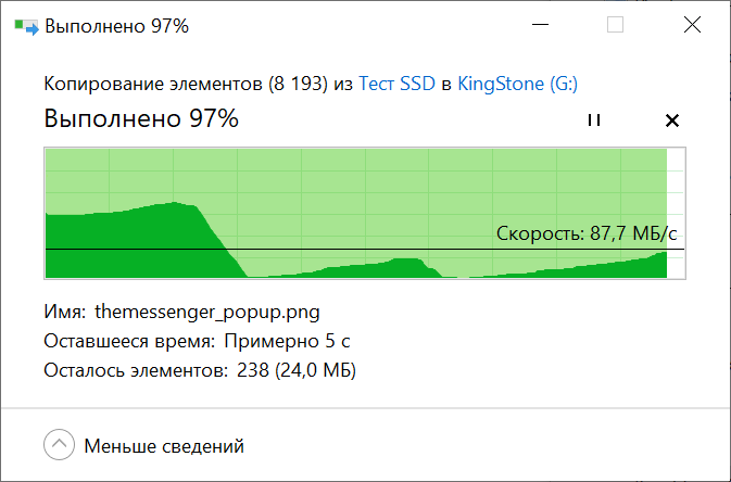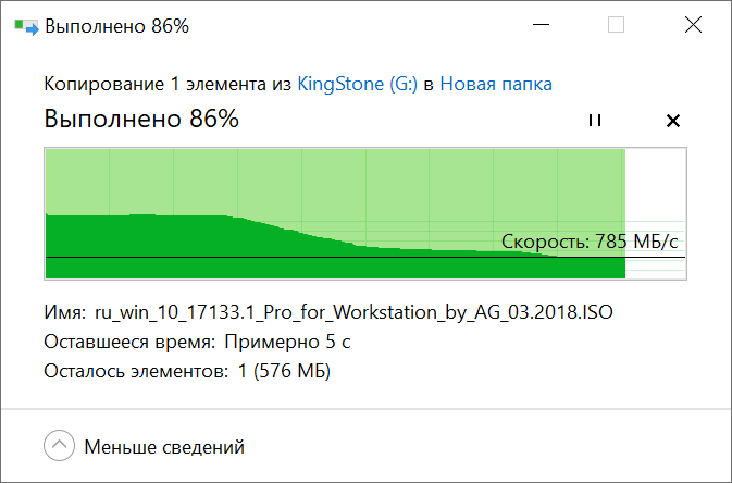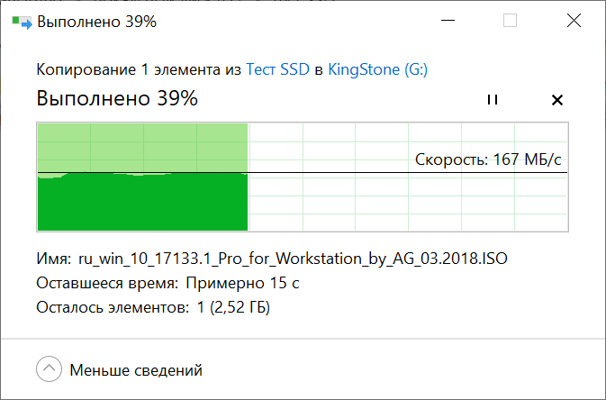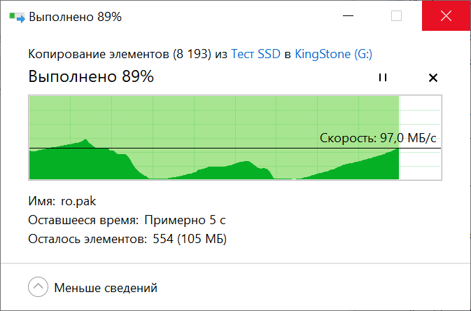 Безусловно необходимо провести тестирование скорости записи/чтения в реальных условиях. Для этого с файлом, объем которого составляет 4.5 Гб были произведены следующие операции: