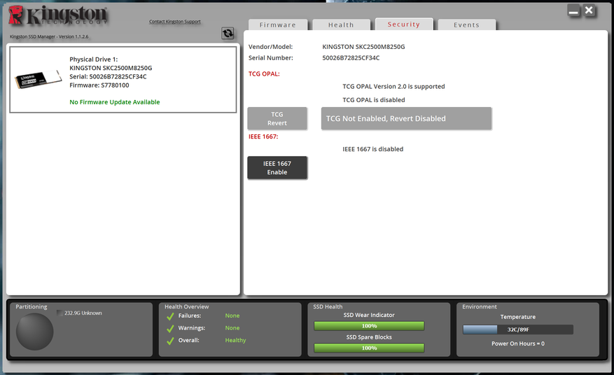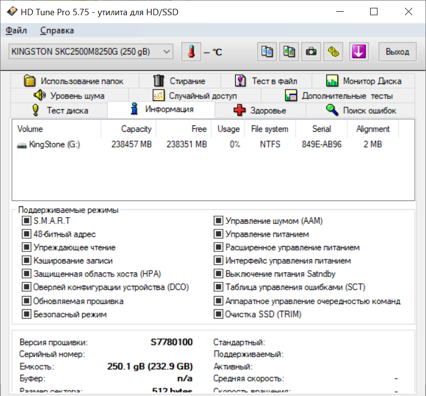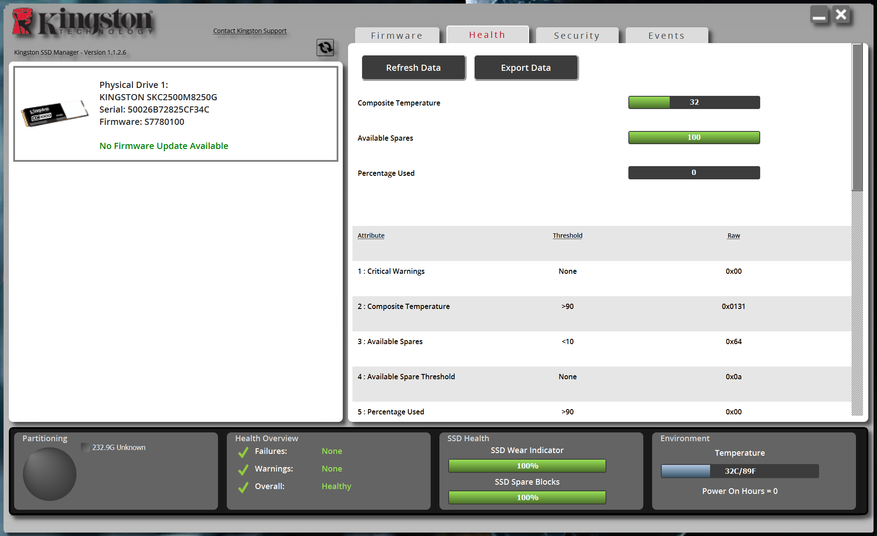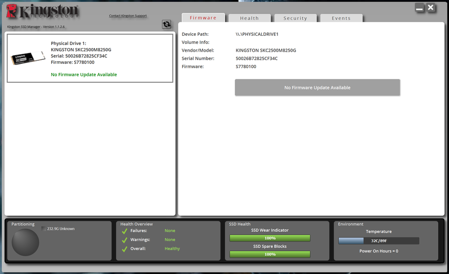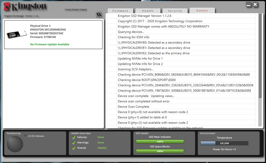 Прежде, чем приступить к тестированию устройства было установлено фирменное приложение Kingston SSD Manager, которое не только позволяет получить основные сведения о накопителе (наименование модели, объем накопителя, серийный номер, температура, и т.д…), но и позволит осуществить обновление прошивки, для обеспечения стабильной работы NVMe SSD.