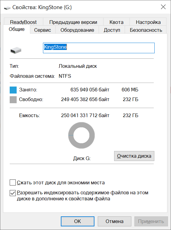 После установки накопителя перед его использованием, необходимо пройти процедуру инициализации, осуществить разметку накопителя и назначить букву для тома. После этого операционная система Windows 10 Pro сразу распознала устройство. Пользователю доступно 232 Гб.