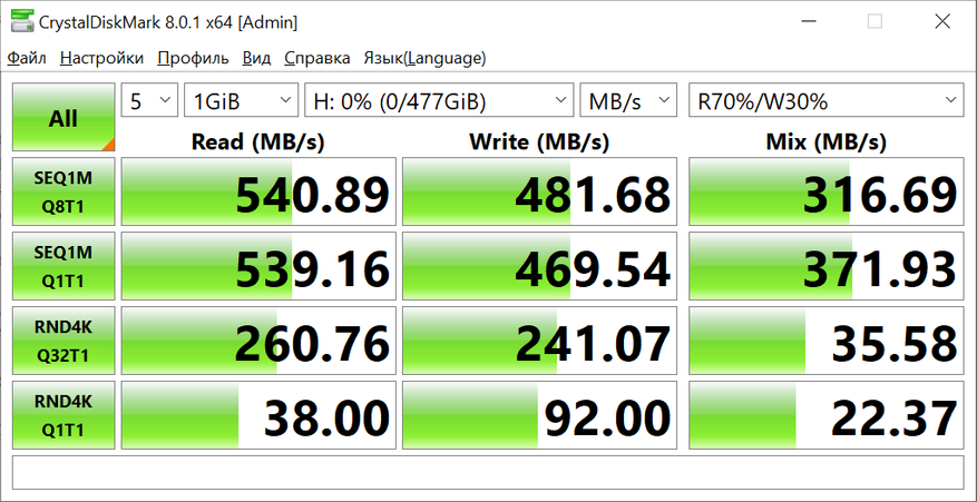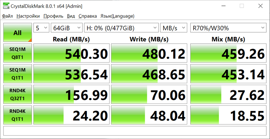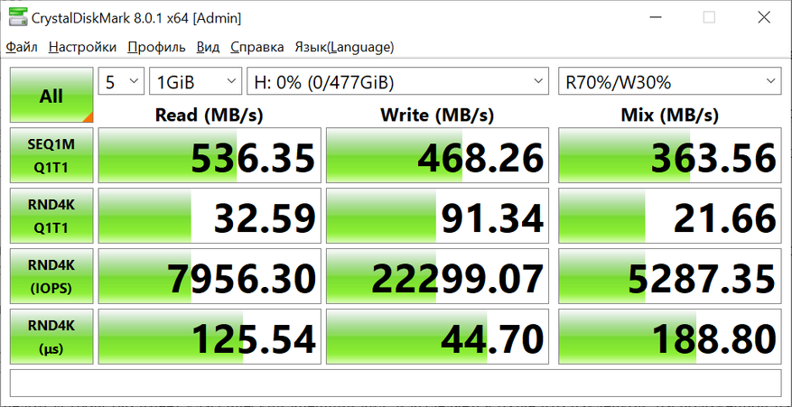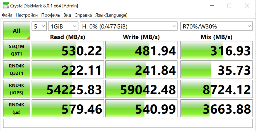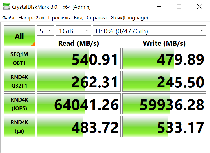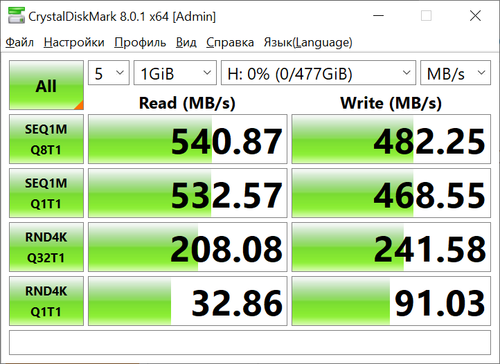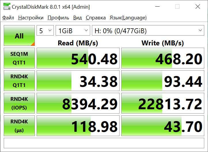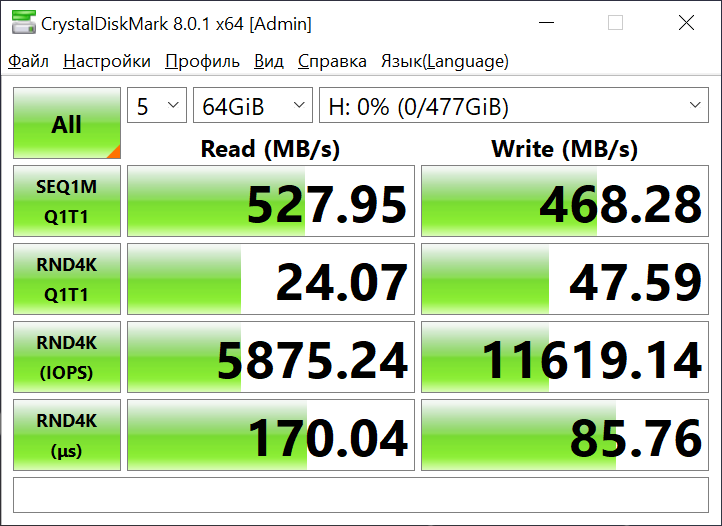 Тестирование твердотельного накопителя SSD Silicon-Power Ace A55 512GB происходило в несколько этапов. На первом этапе осуществлялся замер скоростных характеристик устройства при помощи различных специализированных утилит.