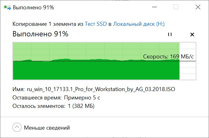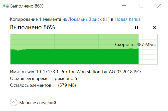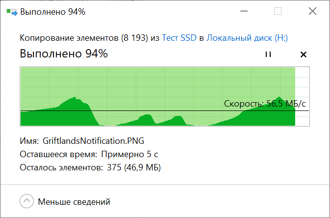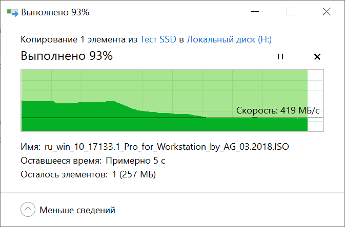 Запись тестового файла объем которого составляет 4.5 Гб, на накопитель SSD M.2 Netac NVME SSD 240GB