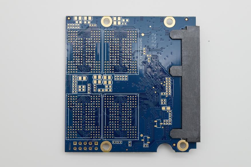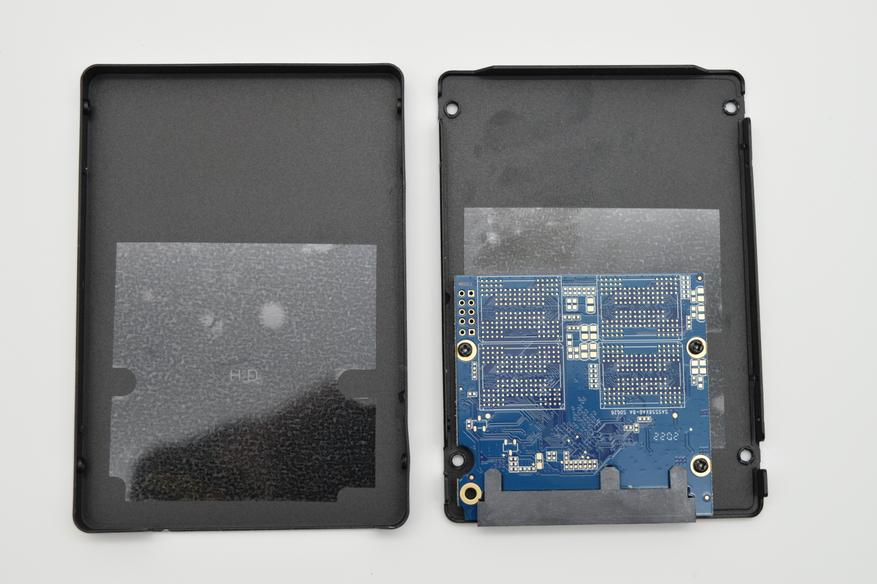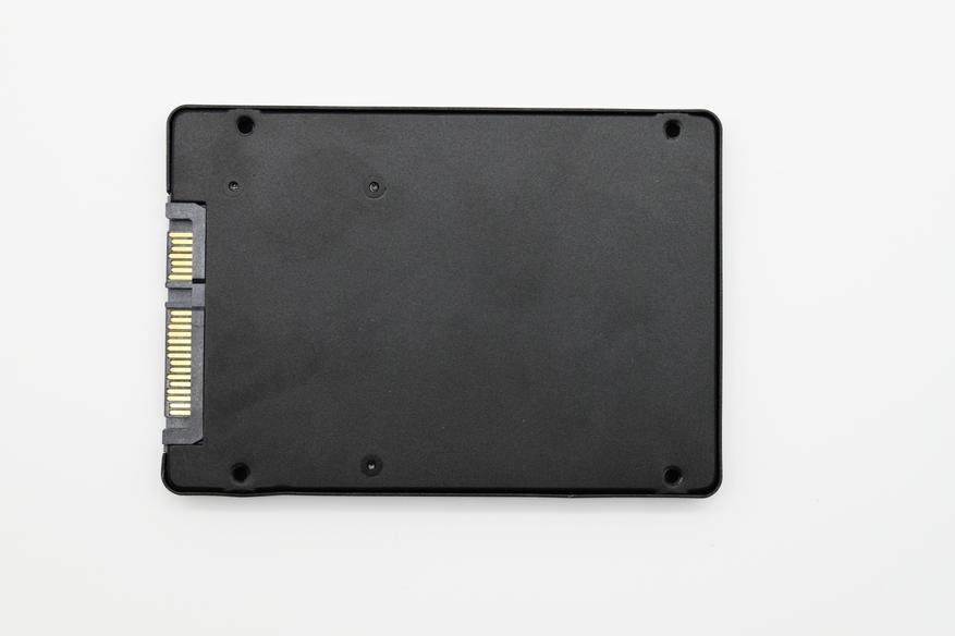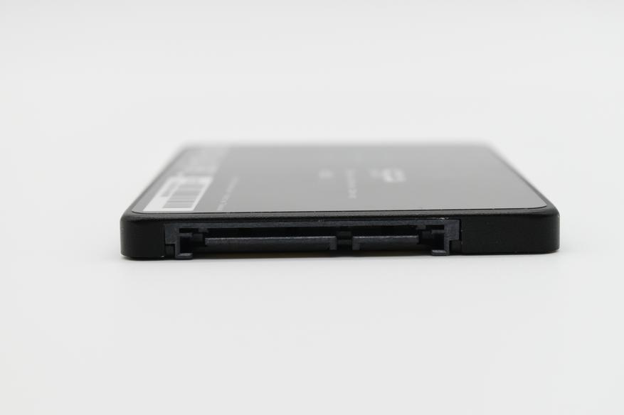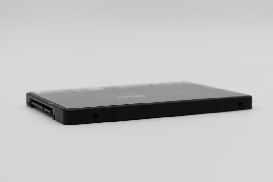 Нижняя поверхность также изготовлена из металла, на ней находится четыре крепежных отверстия, для фиксации накопителя на корпусе. Здесь же расположены специальные отверстия-зацепы, для более удобной разборки корпуса SSD. Также на нижней поверхности можно увидеть интерфейс SATA 3.0, частота шины которого может доходить до 6 ГГц. Пропускная способность достигает 6 Гбит/c (550 — 600 Мбайт/c) и интерфейс для подключения питания.