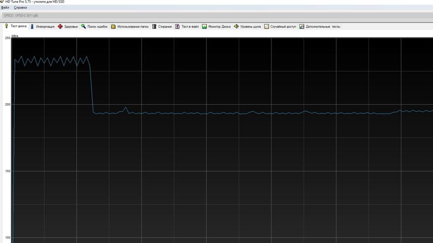 Теперь обратимся к графику скорости линейной записи на накопитель в программе HD Tune Pro. Этот график позволяет выявить важные нюансы, о которых производитель мог не упомянуть: именно при записи часто обнаруживаются особенности, способные существенно снизить эффективность устройства — в частности, падение скорости. Как видно из графика, на начальном этапе скорость остаётся стабильной — около 236 МБ/с. В данном тесте основное внимание уделяется не абсолютным значениям скорости, а её линейности. Однако примерно на отметке 60 ГБ наблюдается снижение скорости до 190 МБ/с. Что это означает? Подобное падение свидетельствует о переполнении буфера записи. Судя по всему, накопитель реализован по технологии SSD — вероятно, это SSD‑накопитель на USB‑мосте. Однако в открытых источниках мне не удалось найти прямого подтверждения этой гипотезе: имеются лишь отдельные предположения и косвенные доводы.