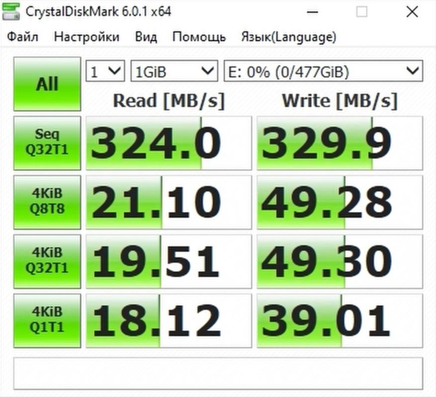 Для измерения скорости чтения и записи использовалась программа CrystalDiskMark. По результатам теста были получены следующие показатели: 324 МБ/с на чтение и 330 МБ/с на запись. Напомним: заявленная скорость чтения составляет 350 МБ/с — фактически получено 324 МБ/с, что довольно близко к обещанному. Что касается записи, заявлено до 411 МБ/с, однако в тесте зафиксировано лишь 330 МБ/с — это заметно ниже. Однако не стоит спешить с выводами. Данные тесты являются синтетическими, а разные программы могут показывать отличающиеся результаты, поскольку используют различные алгоритмы тестирования и измерений.