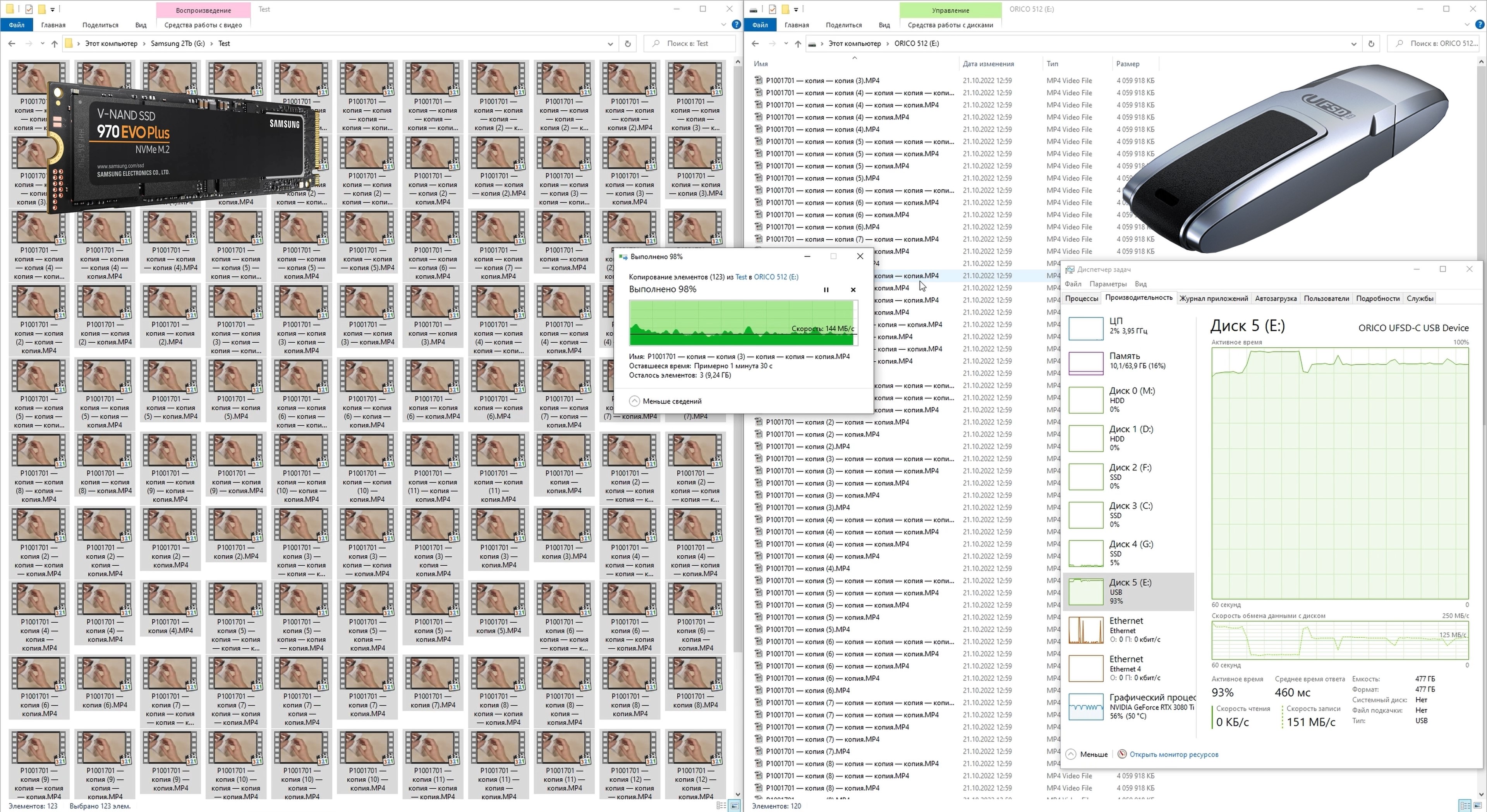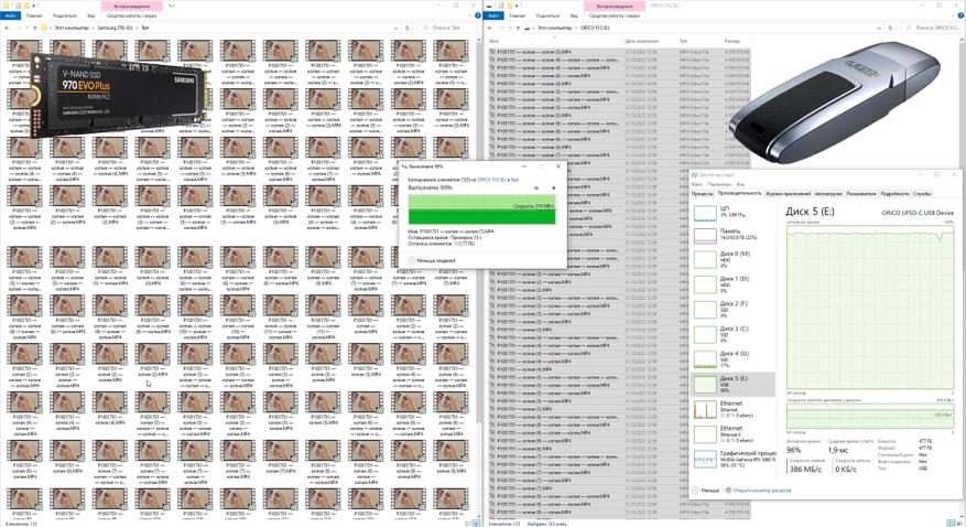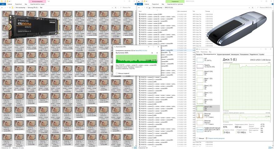 Синтетические тесты показали хорошие результаты, но что же получает обычный пользователь при эксплуатации в повседневной жизни? Для тестирования был подготовлен набор видеофайлов размером 3,87 ГБ каждый — их общий объём соответствует ёмкости исследуемого накопителя. Файлы последовательно скопировали на целевой носитель. Источник данных — накопитель Samsung SSD 970 Evo Plus ёмкостью 2 ТБ, подключённый к интерфейсу PCI Express 3.0. Пропускная способность шины заведомо превышает потребности теста, поэтому скорость передачи данных не ограничивается этим звеном. Это подтверждается данными диспетчера задач: загрузка исходного накопителя в среднем составляет 5 %, тогда как накопитель ORICO загружен на 100 %. Таким образом, мы фиксируем реальную скорость работы накопителя ORICO в проводнике при линейном копировании крупных файлов. Несмотря на значительные колебания скорости, при усреднении показатель составляет порядка 150 МБ/с для операции записи.