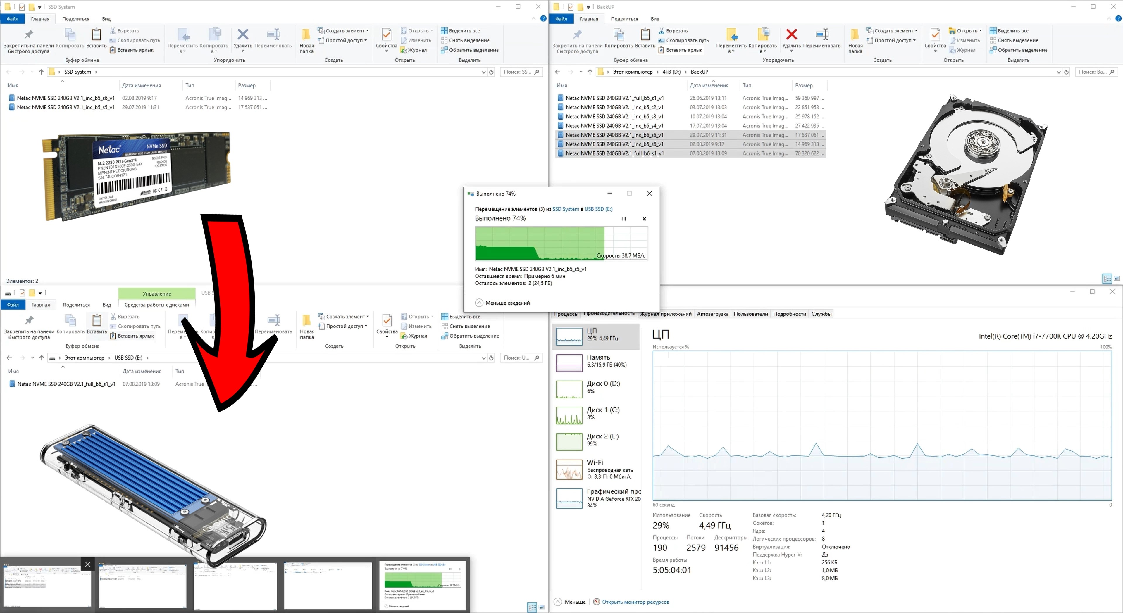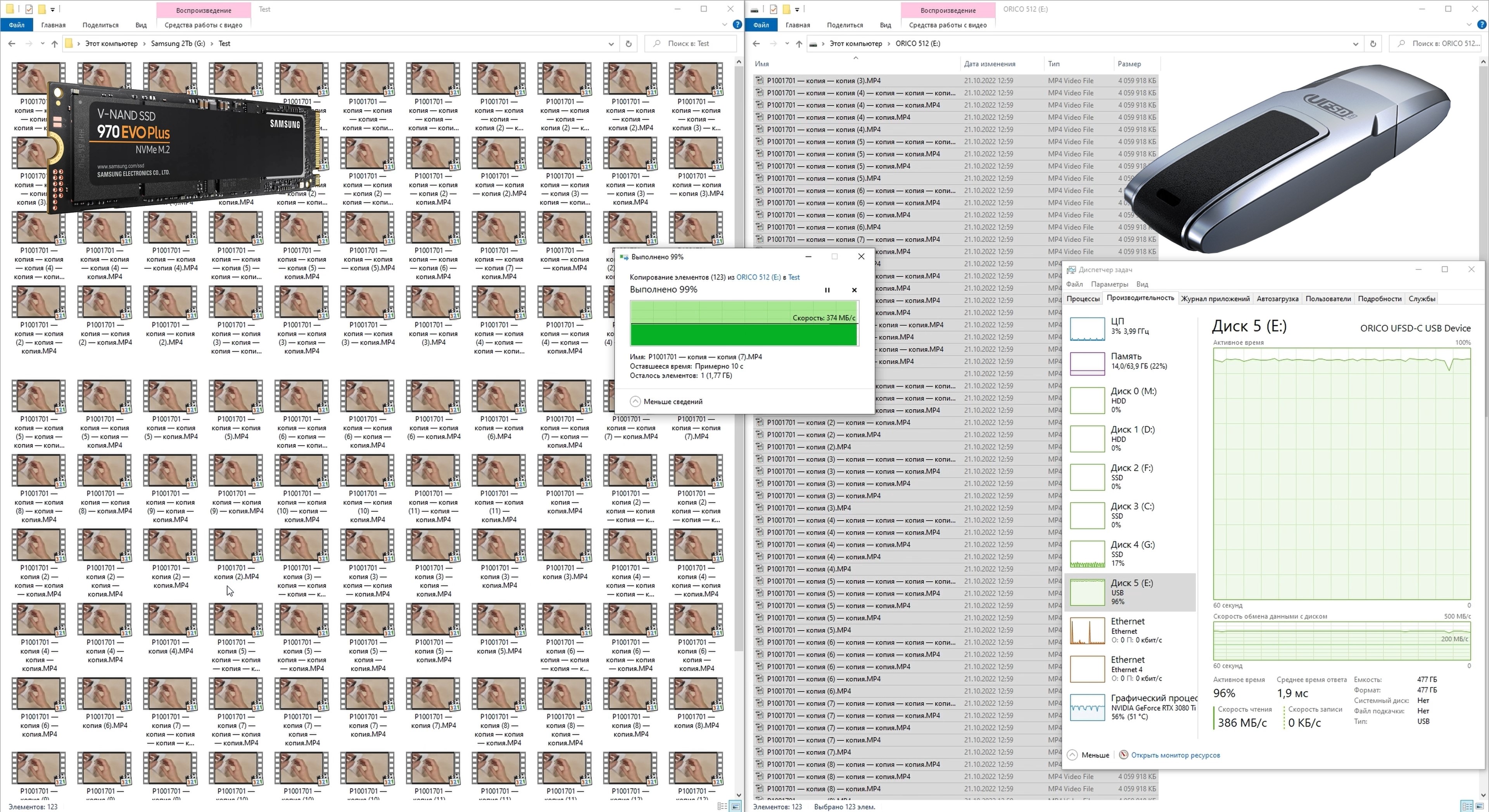 Для проверки скорости чтения с накопителя все записанные на него файлы были перенесены обратно на SSD‑диск. В этом случае скорость остаётся практически неизменной и стабильно составляет 367-369 МБ/с, что демонстрирует более высокий результат. При этом видно, что ограничение скорости обусловлено не SSD‑накопителем, а характеристиками накопителя Orico. Загрузка SSD не превышает 20 %, тогда как накопитель Orico загружен на 100 %. Таким образом, мы наблюдаем реальную скорость чтения накопителя Orico в проводнике.