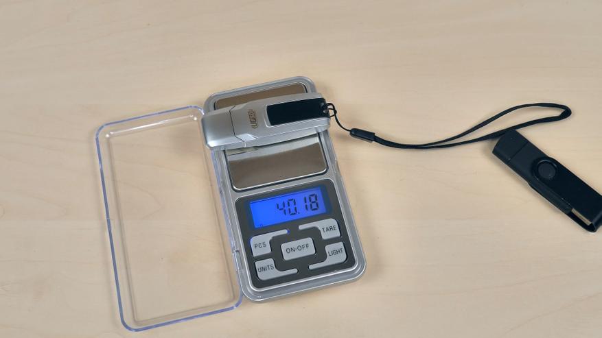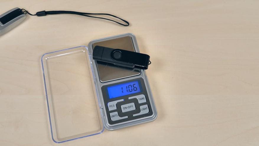 Поскольку корпус накопителя выполнен из металла, устройство получается довольно тяжёлым. Для сравнения: популярная стандартная флешка с AliExpress — даже с металлической скобой — весит всего 11 грамм. Её вряд ли можно назвать лёгкой, однако накопитель ORICO в сравнении с ней выглядит тяжеловесом: его масса составляет целых 40 грамм! Сами по себе эти цифры невелики, но для устройства формата «флешки» такой вес действительно ощущается как значительный.