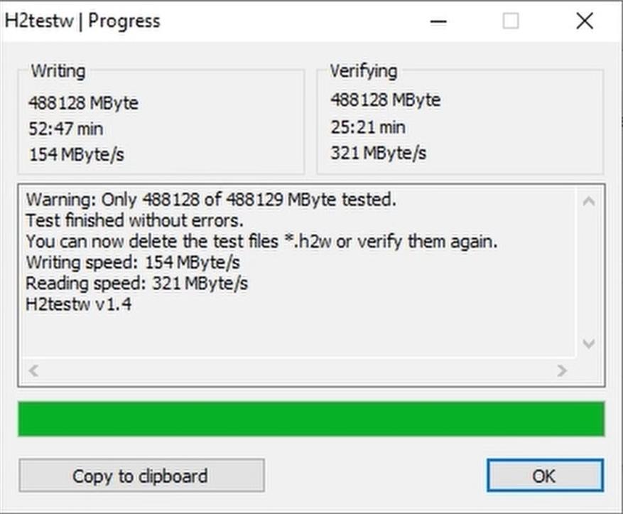 Для проверки реального объёма памяти была использована программа H2testw. Она заполняет весь объём накопителя данными, а затем считывает их. Если все записанные байты успешно считаны, это означает, что фактический объём совпадает с заявленным. По завершении теста программа подтвердила: все данные прочитаны, ошибок не выявлено, объём соответствует заявленному.